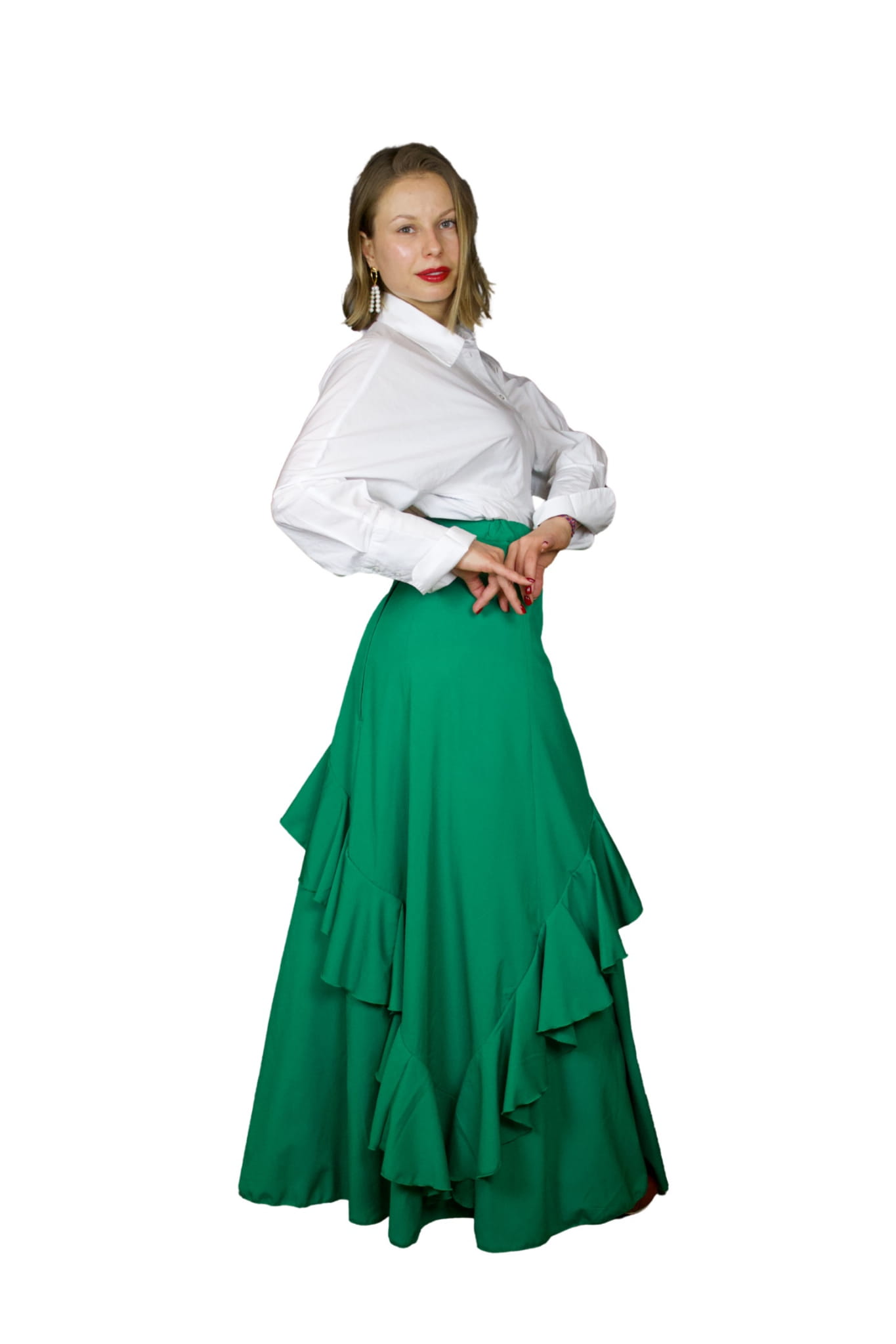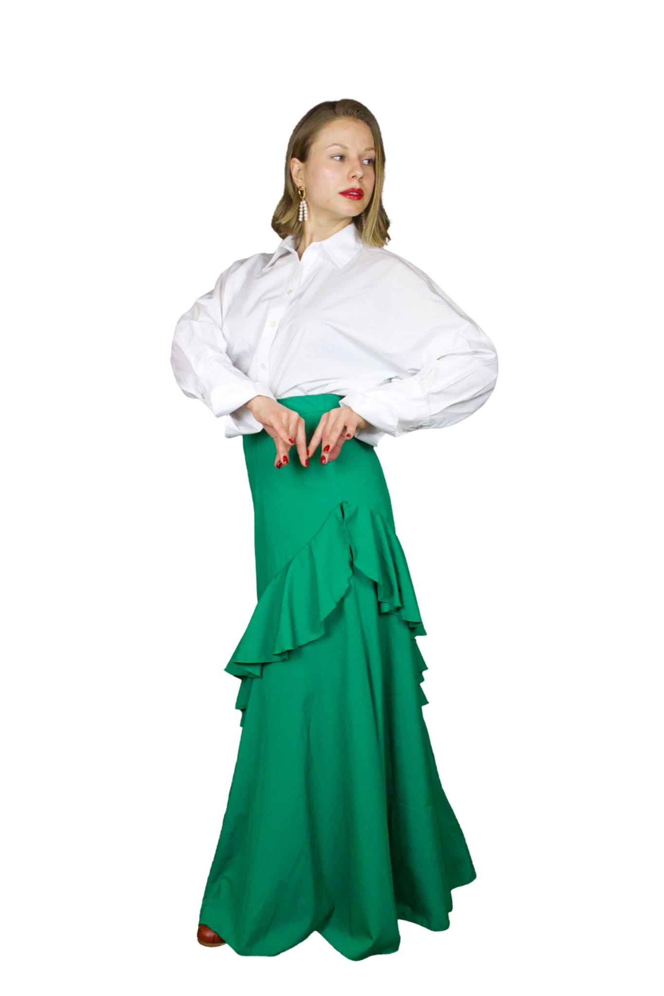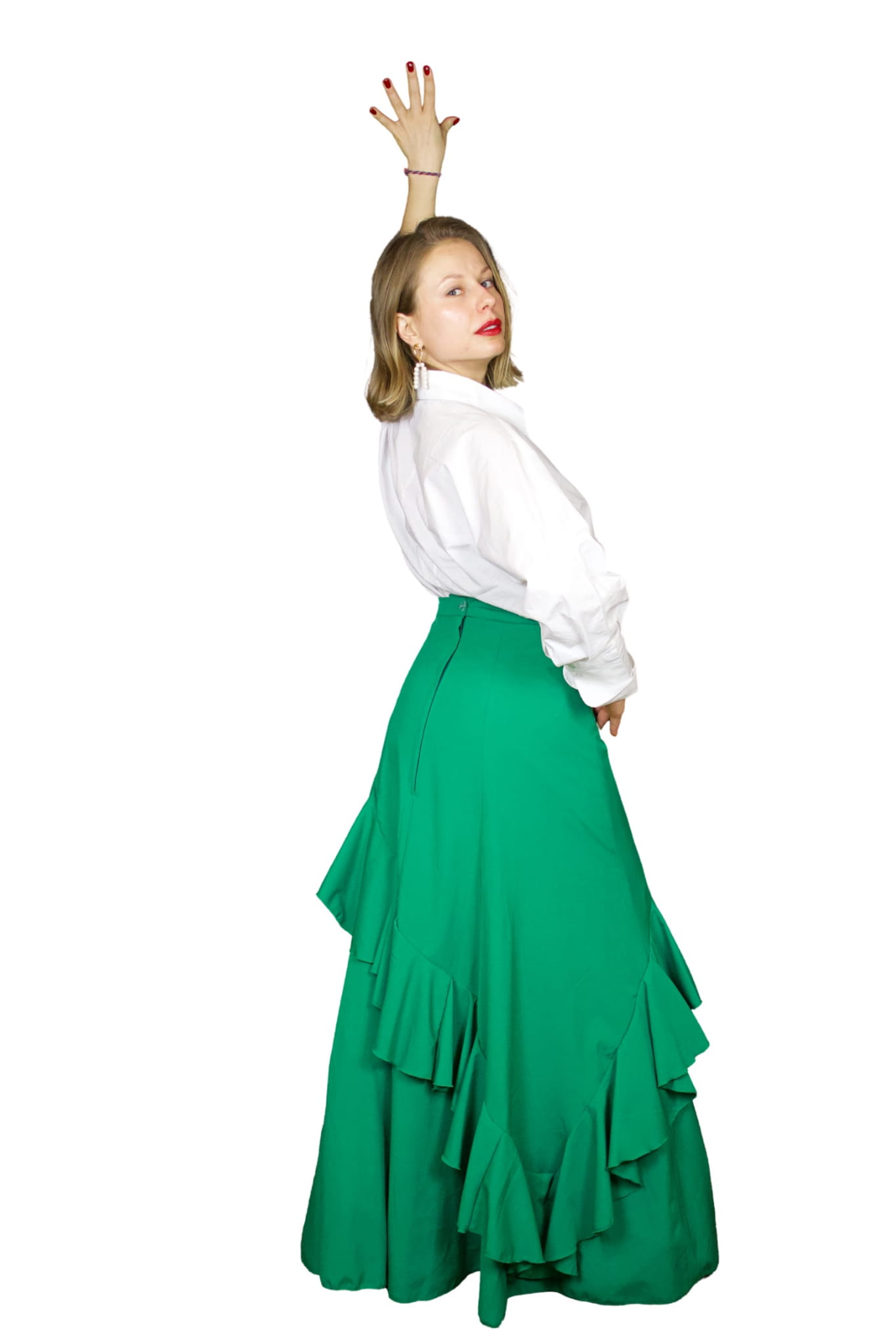 Spódnica Caña to połączenie eleganckiego minimalizmu z oryginalną konstrukcją. Skośne falbany na prostej spódnicy to rozwiązanie, które zachwyci zarówno poszukiwaczki prostoty, jak i miłośniczki flamencowych szaleństw stylistycznych.